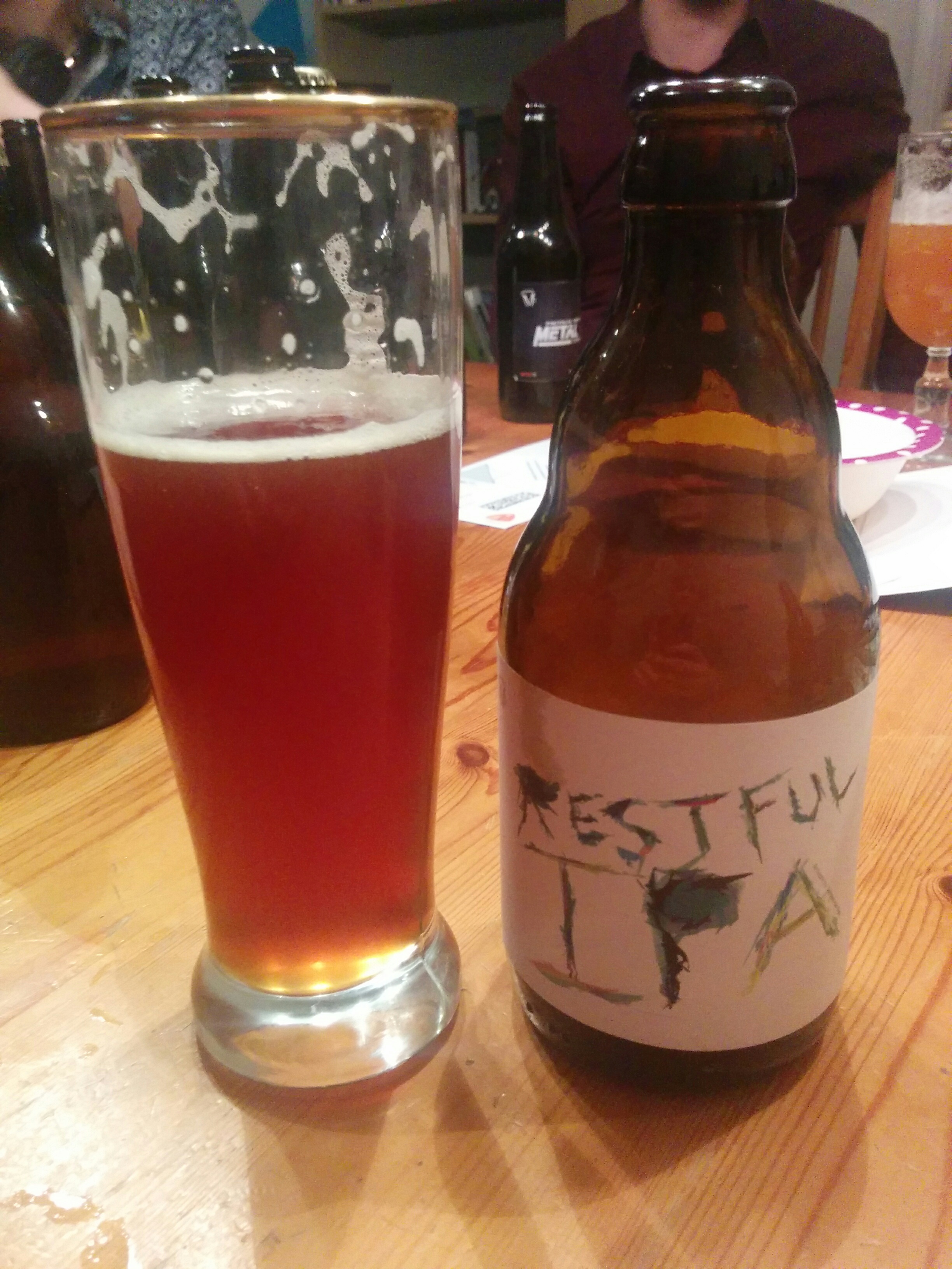 Een tweede IPA, de RESTful IPA. Eigenlijk was het de bedoeling om een stout te brouwen, maar door wat logistieke problemen waren de ingrediënten niet op tijd. Omdat de drang om te brouwen wel erg groot was, hebben we met de ingrediënten die we hadden, de rest, deze IPA gebrouwen. Als vervolg op de PrototIPA, en wederom een grote verbetering. De hopsmaken komen in dit brouwsel al mooi naar voren.